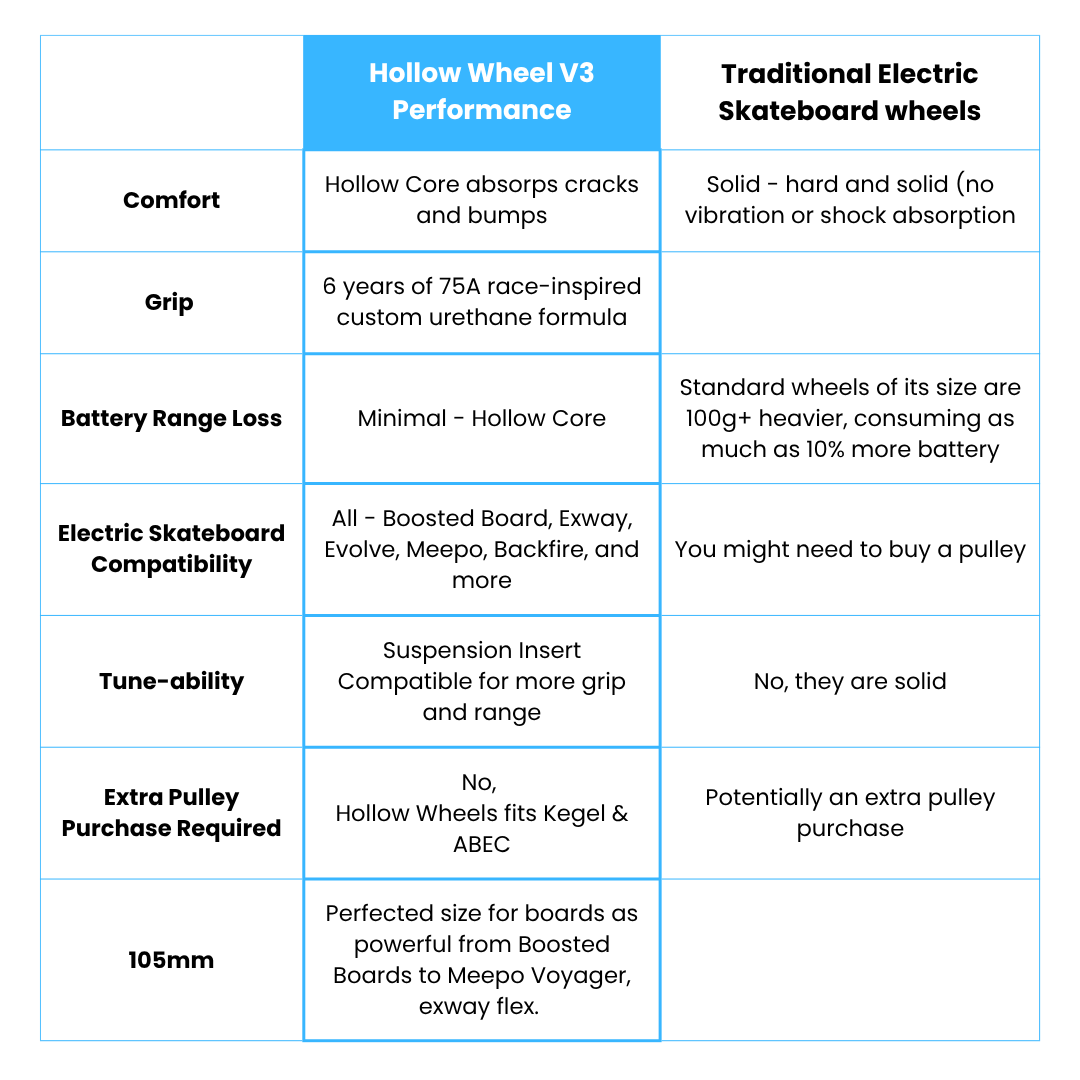Hollow Wheels was designed for all-around superb comfort and grip while providing minimal range loss.