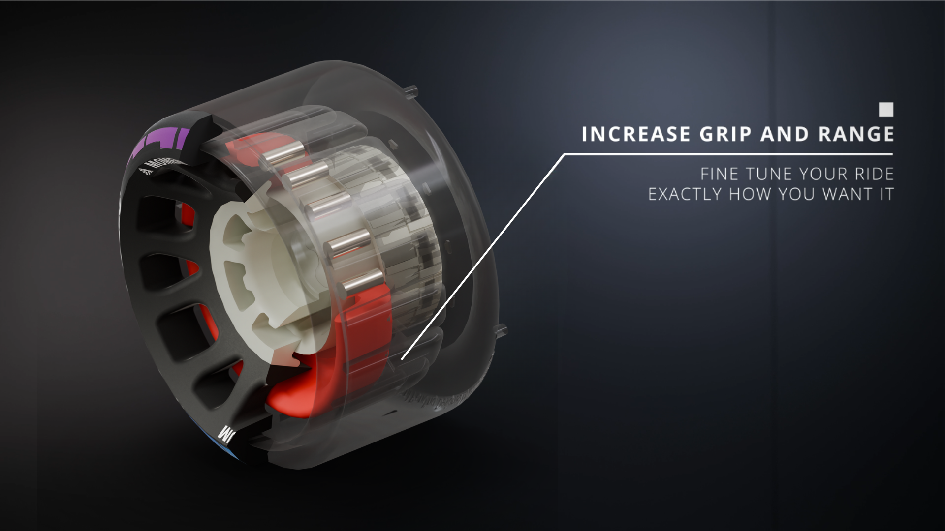When you're going straight, you have a smaller contact patch and you're riding on the solid part of the wheel. So it mimics a road bike. Small contact area and low rolling resistance. However, when you start carving, you unlock more grip because the wheel folds over and exposes more contact patch (65mm).